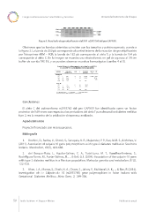 Congreso Internacional en Salud Pública y Desastres Universidad Autónoma de Chiapas Figura 1. Resultado de genotipifcación del SNP rs2975760 del gen CAPN10. Obsérvese que las bandas obtenidas coinciden con los tamaños y patrón esperado, acorde a la fgura 3. La banda de 250 pb corresponde al control interno de la reacción de genotipifcación por Tetraprimer ARM – PCR; la banda de 182 pb corresponde al alelo T; y la banda de 104 pb corresponde al alelo C. En la imagen se muestra una electroforesis en gel de agarosa al 3% en bufer de corrida TAE 1X, y se pueden observar muestras homocigotas (carriles 4 al 8). Conclusiones El alelo C del polimorfsmo rs2975760 del gen CAPN10 fue identifcado como un factor protector de 0.69 veces con respecto a los portadores del alelo T para desarrollar diabetes mellitus tipo 2, en la muestra de la población chiapaneca analizada. Agradecimientos Proyecto fnanciado con recurso propios. Bibliografía 1. Bodhini, D., Radha, V., Ghosh, S., Sanapala, K. R., Majumder, P. P., Rao, M. R. S., & Mohan, V. (2011). Association of calpain 10 gene polymorphisms with type 2 diabetes mellitus in Southern Indians. Metabolism, 60(5), 681-688. 2. del Bosque-Plata, L., Aguilar-Salinas, C. A., Tusié-Luna, M. T., Ramı́rez-Jiménez, S., Rodrı́guez-Torres, M., Aurón-Gómez, M., ... & Bell, G. I. (2004). Association of the calpain-10 gene with type 2 diabetes mellitus in a Mexican population. Molecular genetics and metabolism, 81(2), 122-126. 3. Khan, I. A., Movva, S., Shaik, N. A., Chava, S., Jahan, P., Mukkavali, K. K., ... & Rao, P. (2014). Investigation of< i> Calpain 10 (rs2975760) gene polymorphism in Asian Indians with Gestational Diabetes Mellitus. Meta Gene, 2, 299-306. 50 Tuxtla Gutiérrez • Chiapas • México Publicación anual