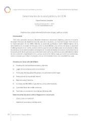 Congreso Internacional en Salud Pública y Desastres Universidad Autónoma de Chiapas Determinantes de la salud pública y los ODM Elysee Bautista González Jurisdicción Sanitaria No. 1. ISECH E-mail: elysseb88@gmail.com Palabras clave: Salud-enfermedad-atención; Chiapas, políticas sociales Introducción Este texto pretende analizar y describir de manera transversal, objetiva y práctica el sistema de salud mexicano en el primer nivel de atención a la salud y la importancia que tiene éste en la implementación de los ODM. Además se pretende puntualizar claros determinantes de la salud pública en el estado de Chiapas, como la accesibilidad a los centros de salud, la atención médica prestada en el mismo; la desnutrición, que ha sido abordada pero no erradicada; la falta de personal; los recursos estatales empleados en la salud; el abastecimiento de medicamentos, la burocratización de los procesos en las Jurisdicciones sanitarias; el choque cultural bilateral; la falta de comunicación, empoderamiento y acceso económico de la mujer, así como las condiciones socio culturales que limitan el progreso de las comunidades hacia una sociedad más sana. Objetivos de Desarrollo del Milenio a) Erradicación de la pobreza extrema y hambre b) Logro de la enseñanza primaria universal. c) Promoción de la igualdad de género y la autonomía de la mujer. d) Reducción de la mortalidad infantil. e) Mejora la salud materna. f) Combate del VIH/SIDA, el paludismo y otras enfermedades. g) Sustentabilidad del medio ambiente. h) Fomento una asociación mundial para el desarrollo Determinantes de salud pública: Diagnostico comunitario • ¿Qué es una comunidad? • Identidad, consciencia e integración. 58 Tuxtla Gutiérrez • Chiapas • México Publicación anual